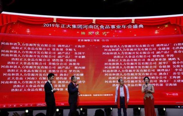 2019年1月21日,“龍頭騰起攬全月,鴻鵠展翅傲中原”——正大集團河南區食品事業2019新春年會在洛陽東華大酒樓盛大召開。正大集團農牧食品企業(中國)副董事長王鴻章、正大集團河南區食品事業***總裁王學斌、正大集團河南區產業化總裁宋小兵及河南區食品事業各公司部門主管、員工代表300餘人齊聚一堂,共享盛典。年會特邀河南東方正大有限公司洛陽飼料廠董事長茹懷智、中方副總經理黃天發及河南和諧人力資源開發有限公司董事、總經理王縣委、副總經理張麗雲參加。