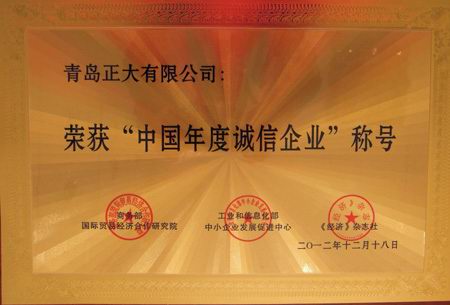 在商務部國際貿易經濟合作研究院、工業和信息化部中小企業發展促進中心、《經濟》雜誌社聯合組織的2012年“中國年度誠信企業”評選活動中,青島正大有限公司榮獲“中國年度誠信企業”殊榮。